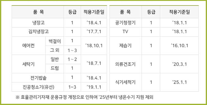 ⚠️ 반드시 아래 인증마크가 붙은 에너지소비효율 등급범위(1~3)이내 이어야 하며, 각 제품별 적용기준일 이후 출시 제품이어야 환급 대상입니다.