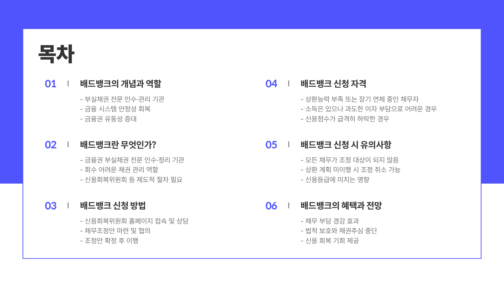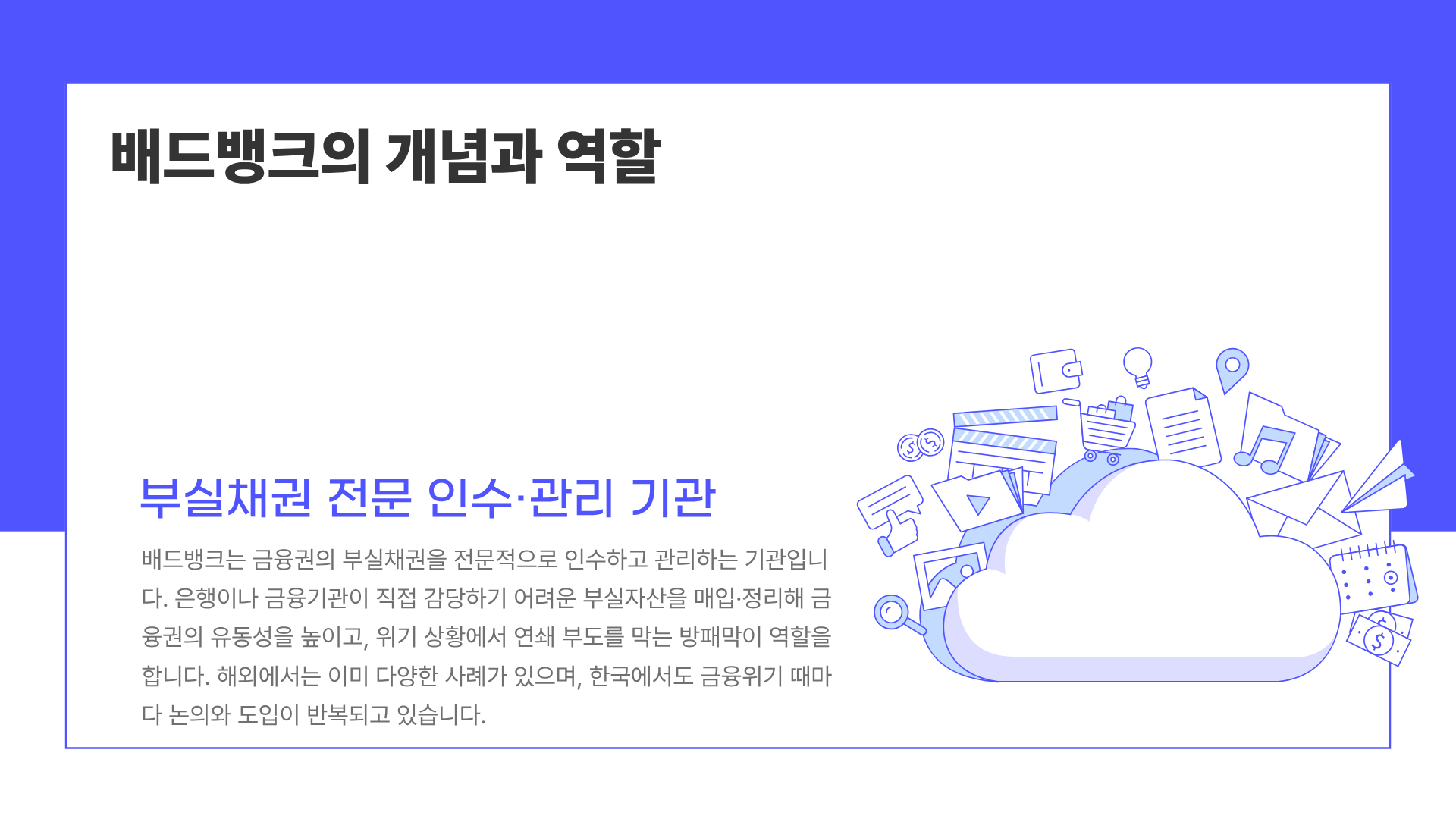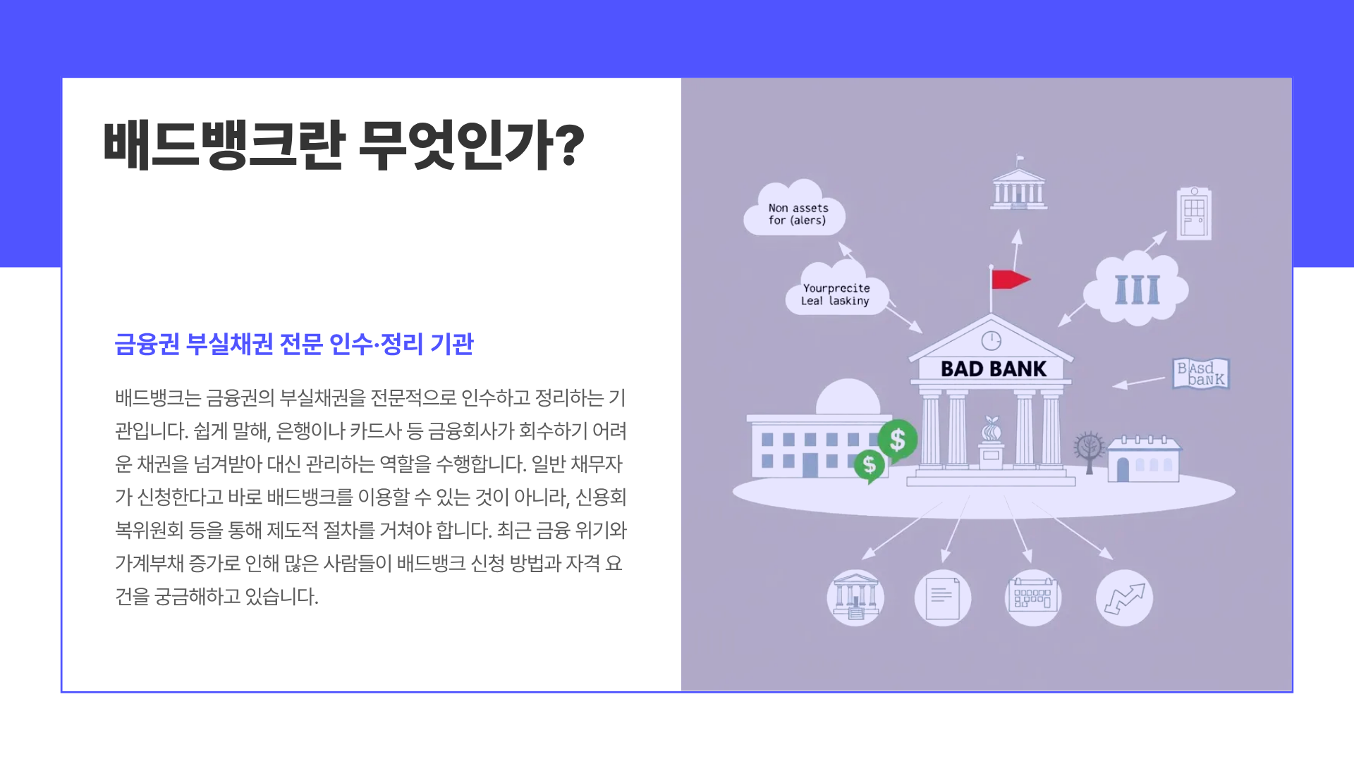 배드뱅크는 금융기관이 보유한 회수 불가능한 채권을 매입해 정리하는 특별 기관입니다. 개인 채무자 입장에서는 채무조정 제도를 통해 간접적으로 연결되는 개념이며, 대표적으로 신용회복위원회에서 운영하는 채무조정 프로그램이 배드뱅크와 유사한 기능을 합니다.