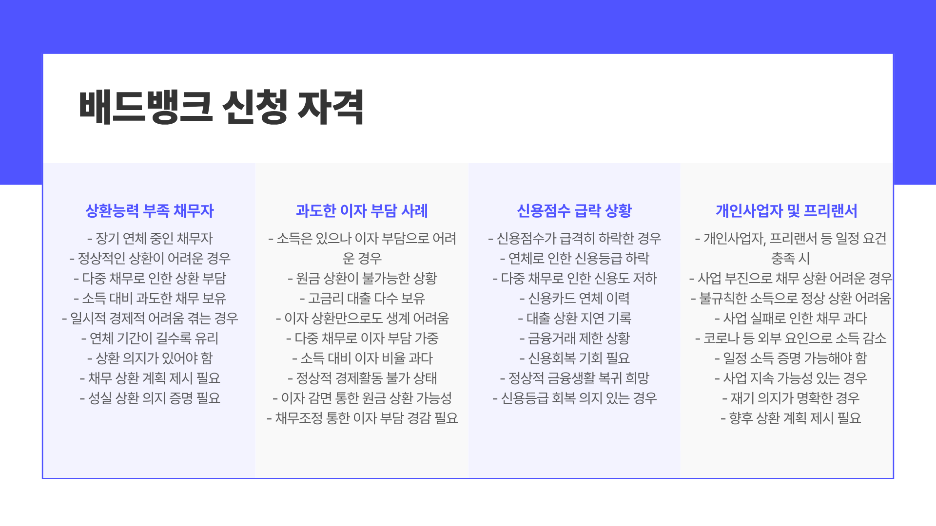 배드뱅크 제도를 이용할 수 있는 대상은 다음과 같습니다: