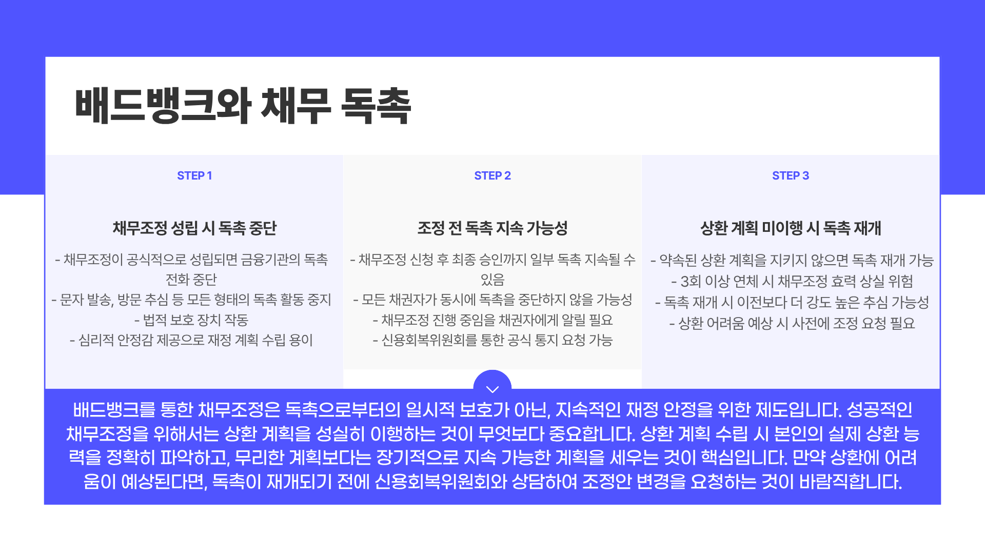 단, 무소득 상태라면 배드뱅크보다는 개인회생이나 파산 절차가 적합할 수 있습니다.