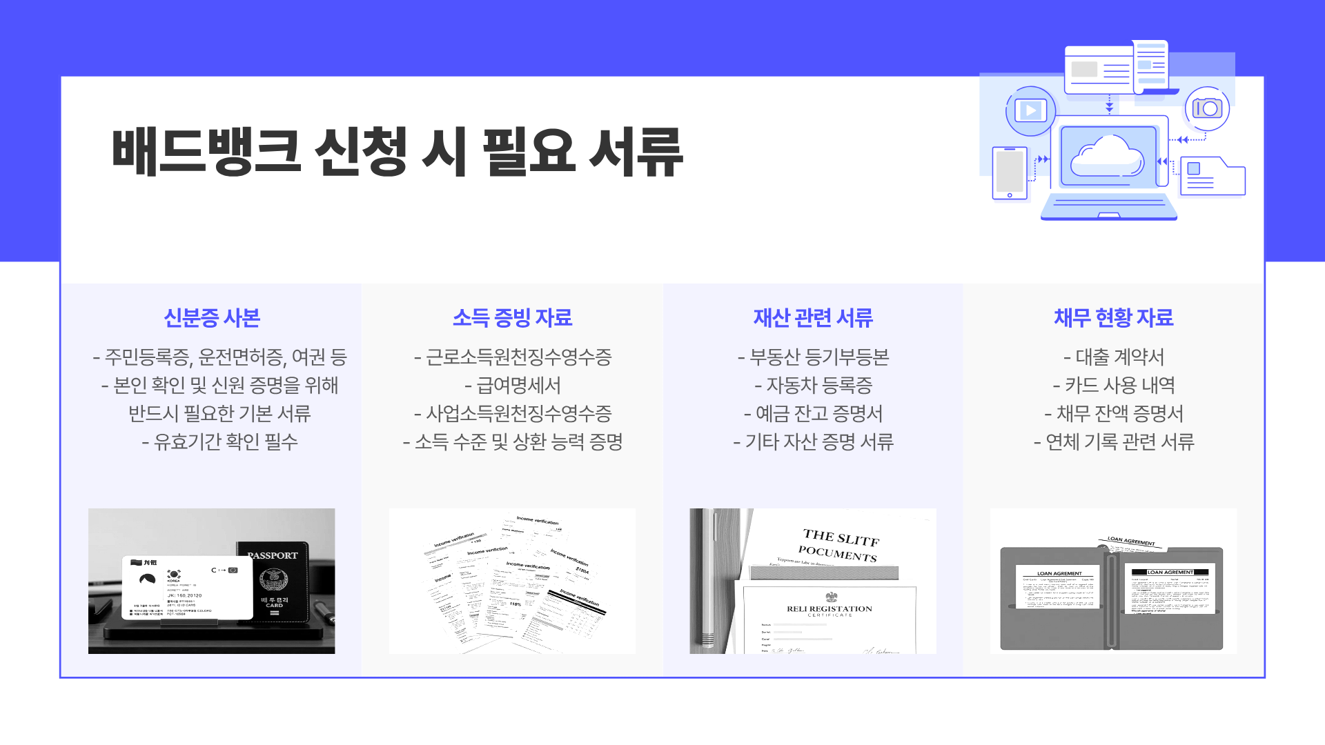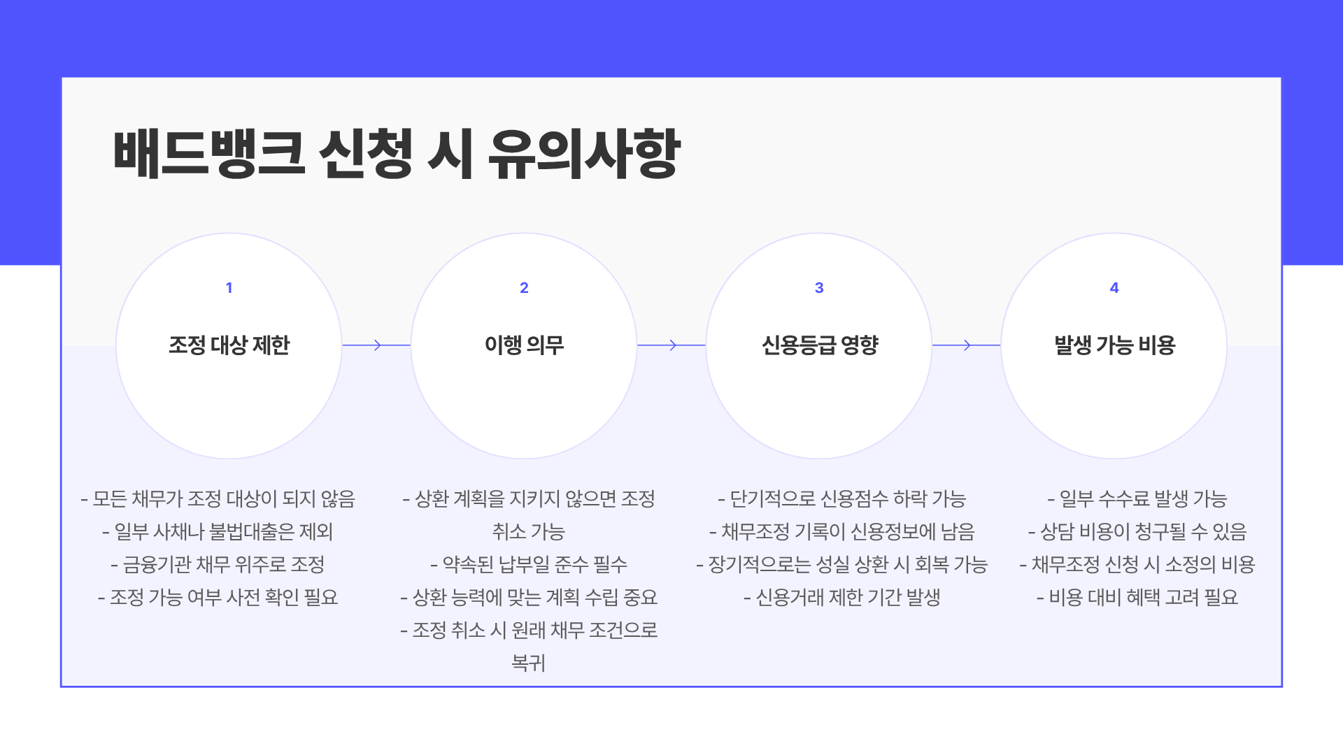 배드뱅크 신청 시 몇 가지 주의할 점이 있습니다: