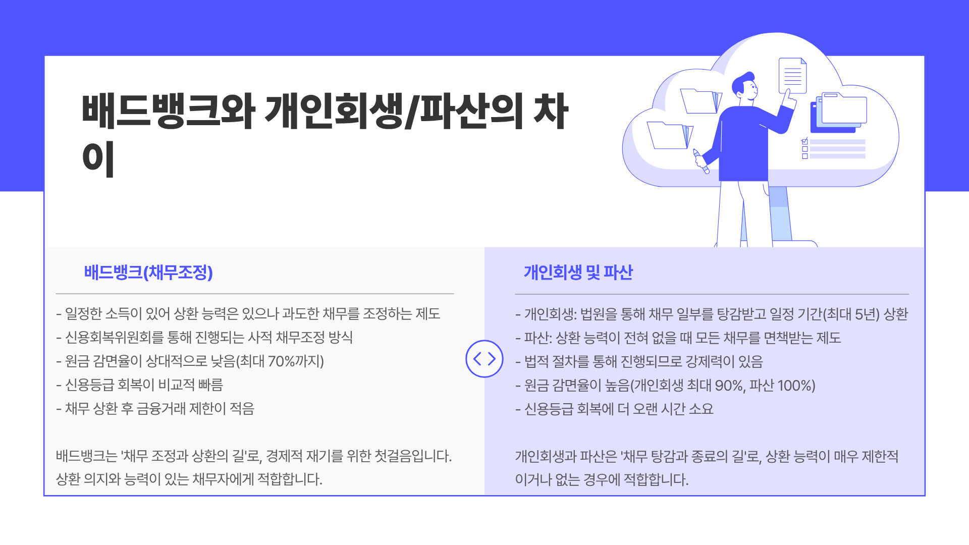 따라서 일정 소득이 있다면 배드뱅크, 소득은 있으나 채무가 과도하다면 개인회생, 소득조차 없으면 파산을 고려해야 합니다.