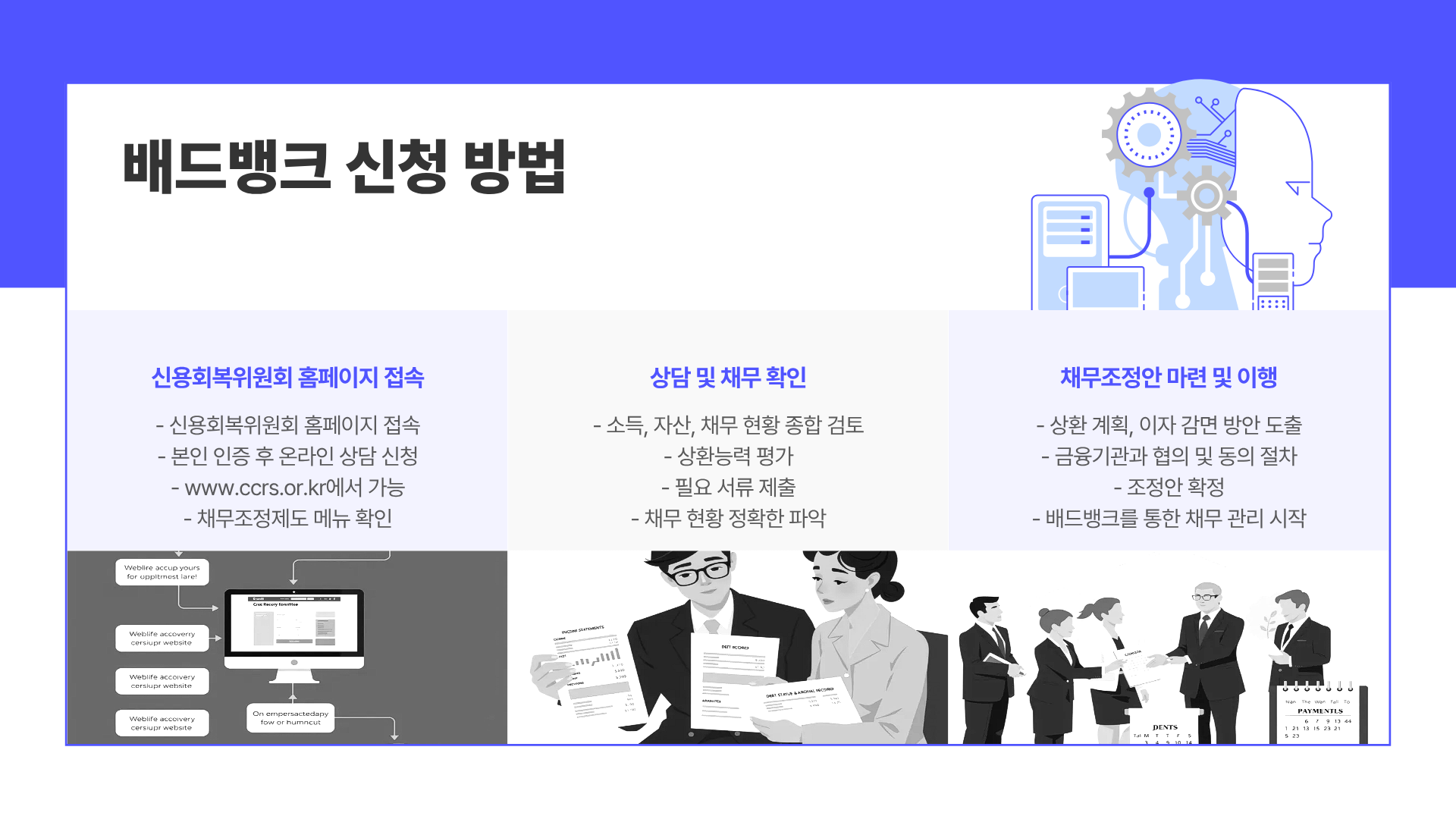 배드뱅크 제도는 직접 은행 창구에서 신청하는 방식이 아니라, 공적 기구를 통해 이뤄집니다. 대표적인 절차는 다음과 같습니다: