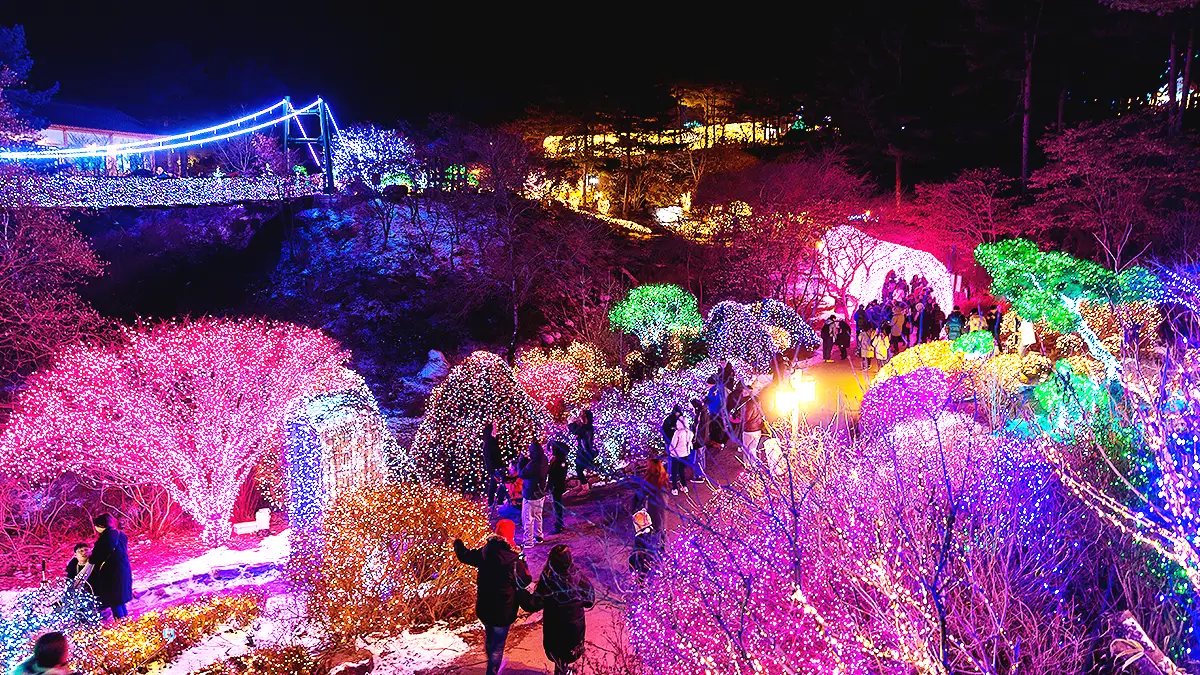 가평의 아침고요수목원은 겨울이 되면 ‘오색별빛정원전’으로 불립니다. 정원 전체가 수백만 개의 조명으로 덮이며, 하늘정원·달빛정원·사랑의 정원 등 테마별로 꾸며져 있습니다. 눈이 내리는 날에는 반사되는 불빛이 만들어내는 풍경이 정말 환상적입니다.